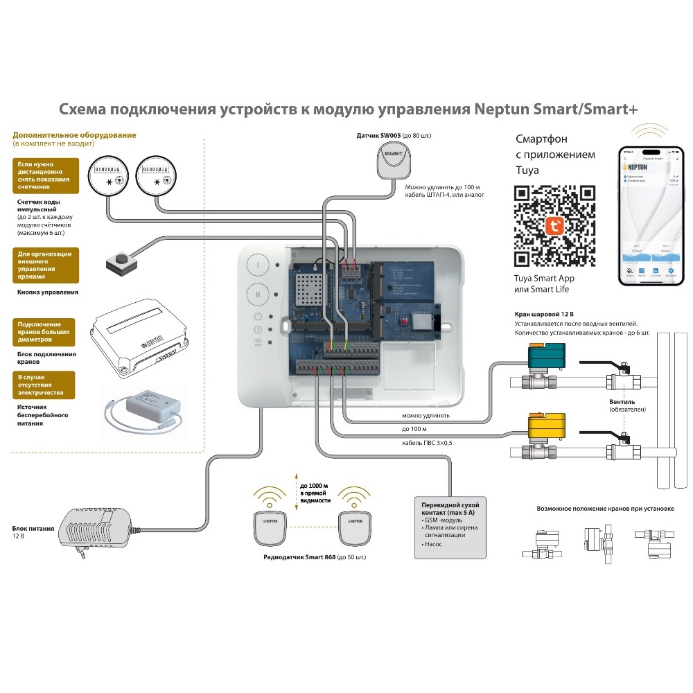 Умная система защиты от протечки воды КОМПЛЕКТ NEPTUN SPECIAL EDITION, УМНЫЙ БЕСПРОВОДНОЙ предназначена для обнаружения и локализации протечек воды в системах водоснабжения. Компоненты системы связаны и взаимодействуют друг с другом через центральный контроллер — модуль управления Neptun Smart+ SE. Это новое поколение модулей управления в линейке Neptun.